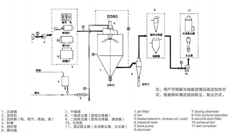 1、熱氣流與霧滴的接觸:有足夠量的熱氣流進(jìn)入噴霧干燥室時(shí),必須考慮熱氣流的方向及角度,無(wú)論是并流、逆流還是混流,確保與霧滴的接觸,才能進(jìn)行充分的熱交換。